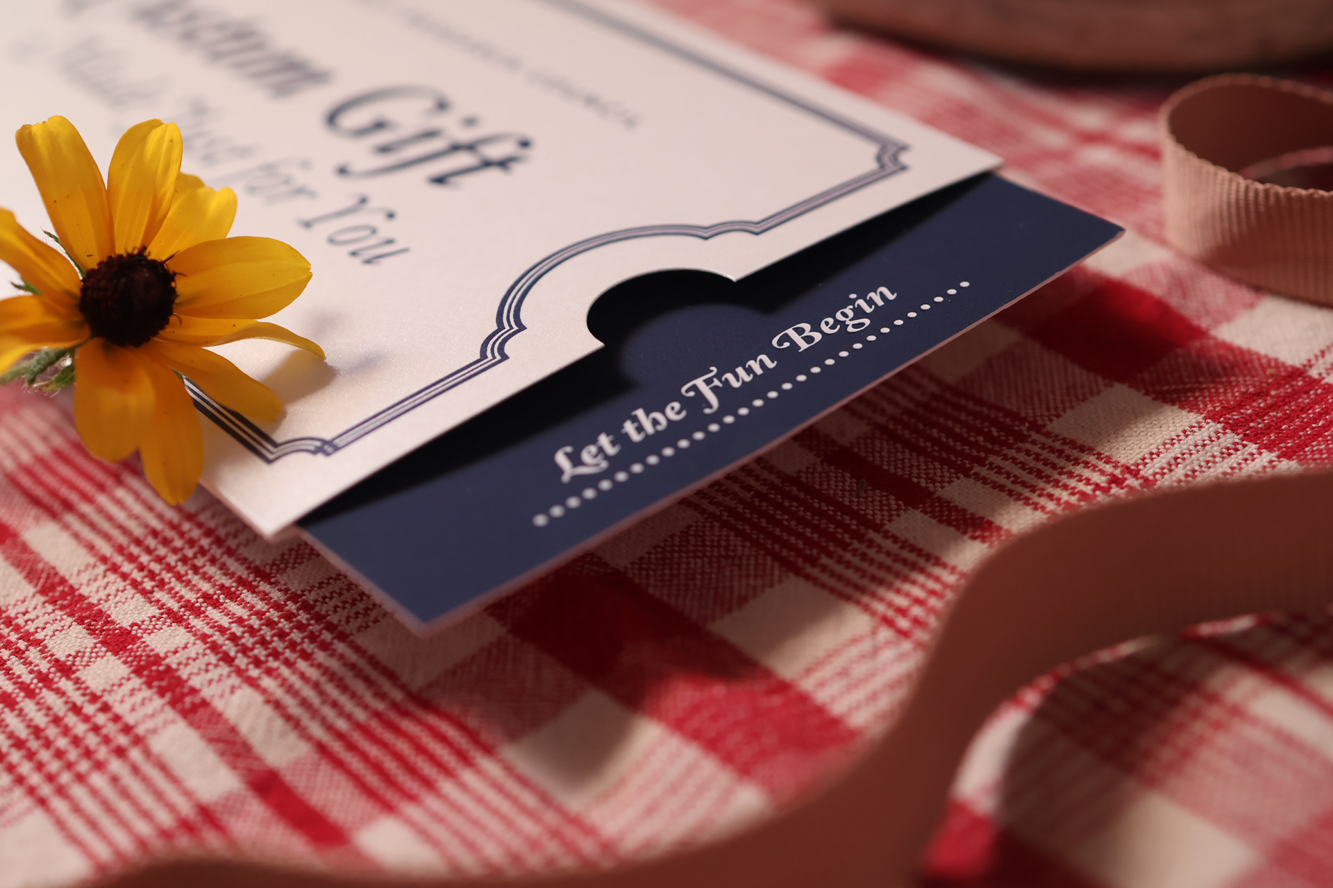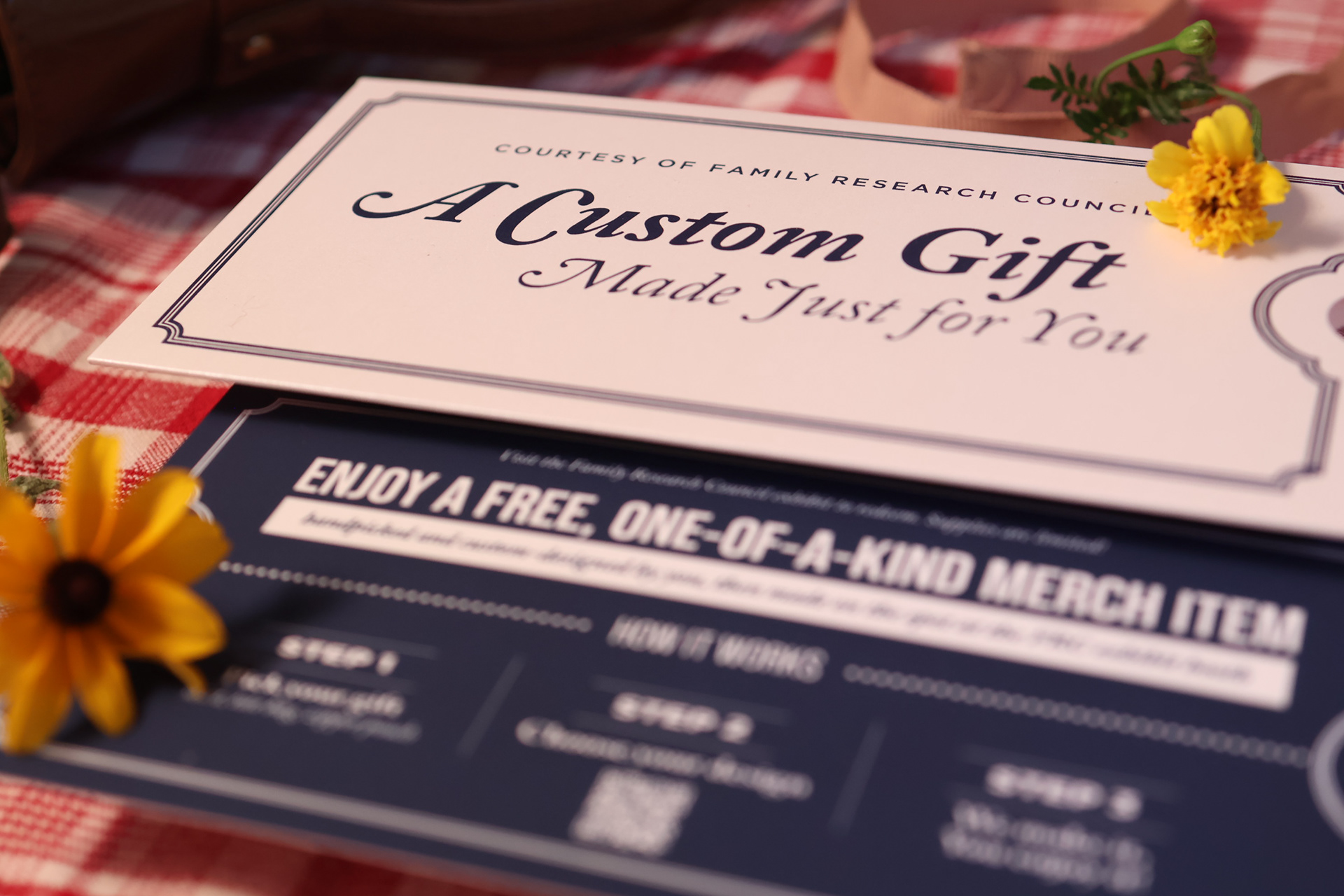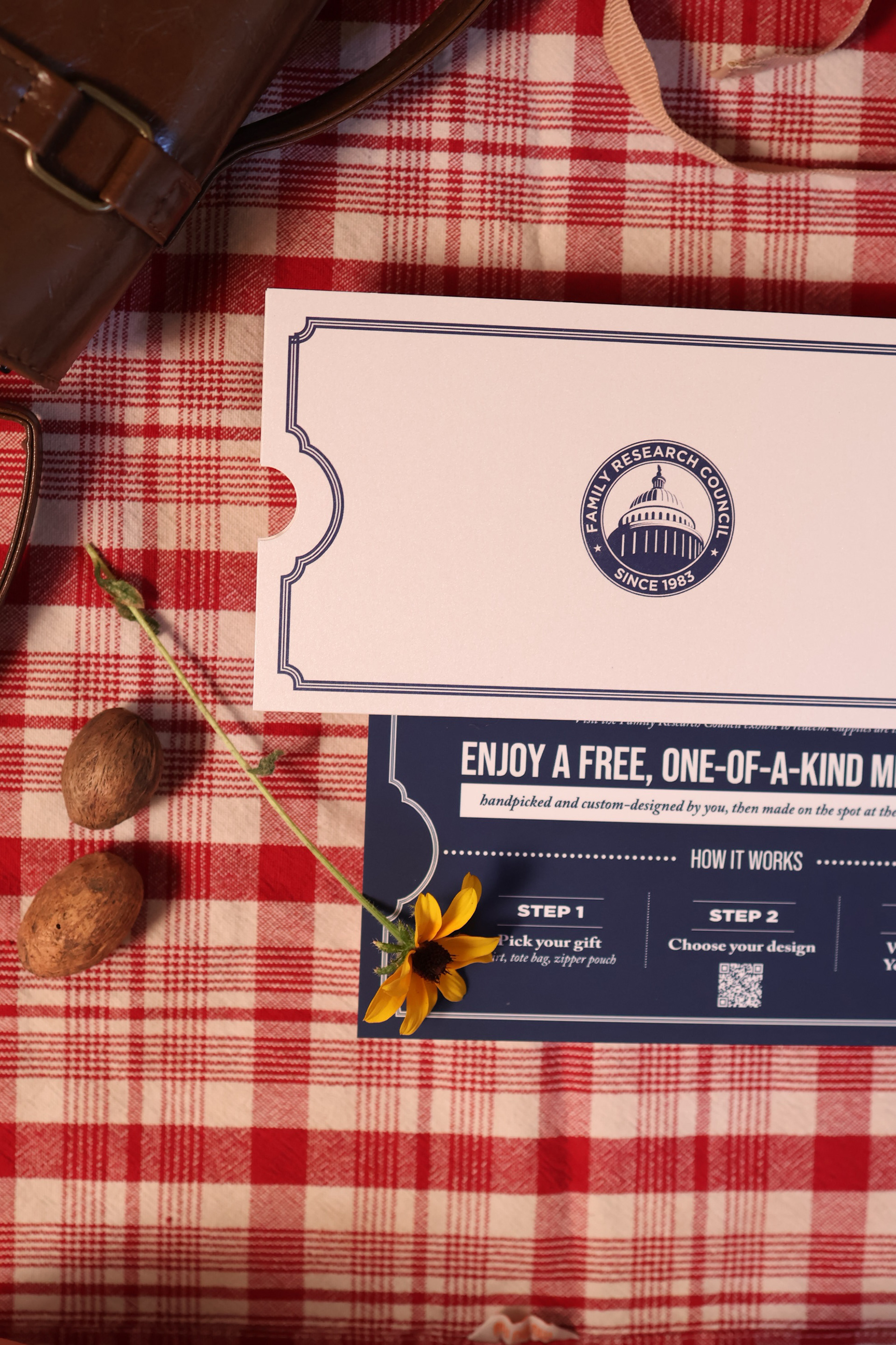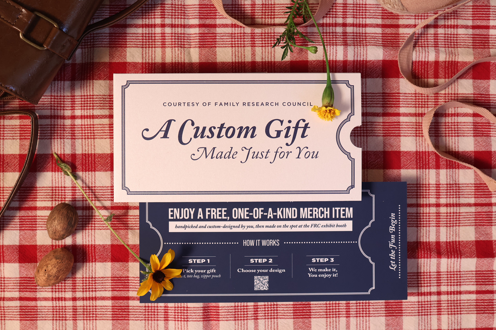 Exquisite custom envelope and ticket invitation, printed on pearlescent beargrass paper and transparent raised ink as merchandise material for Family Research Council at the 2025 Social Conservative Policy Conference.