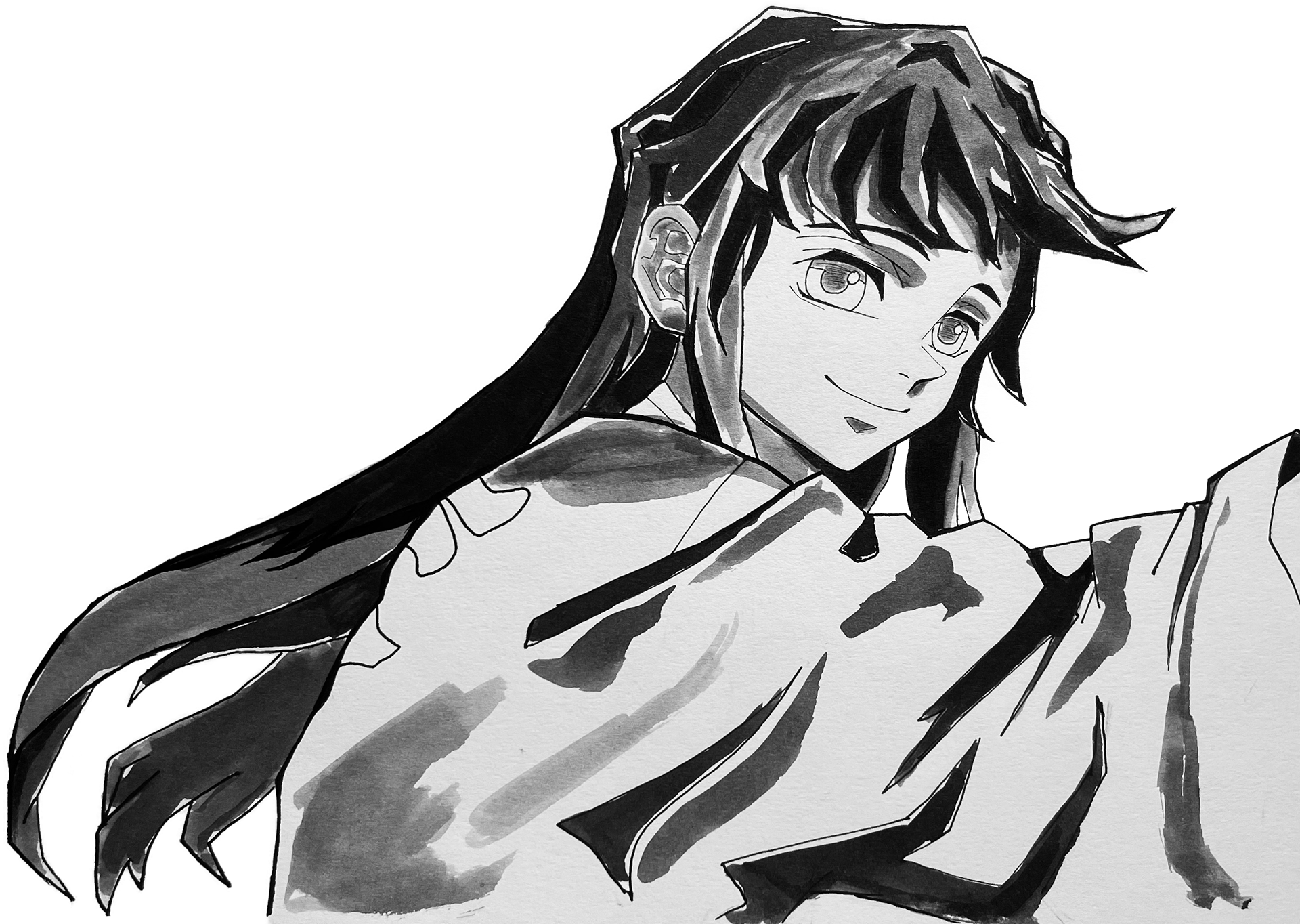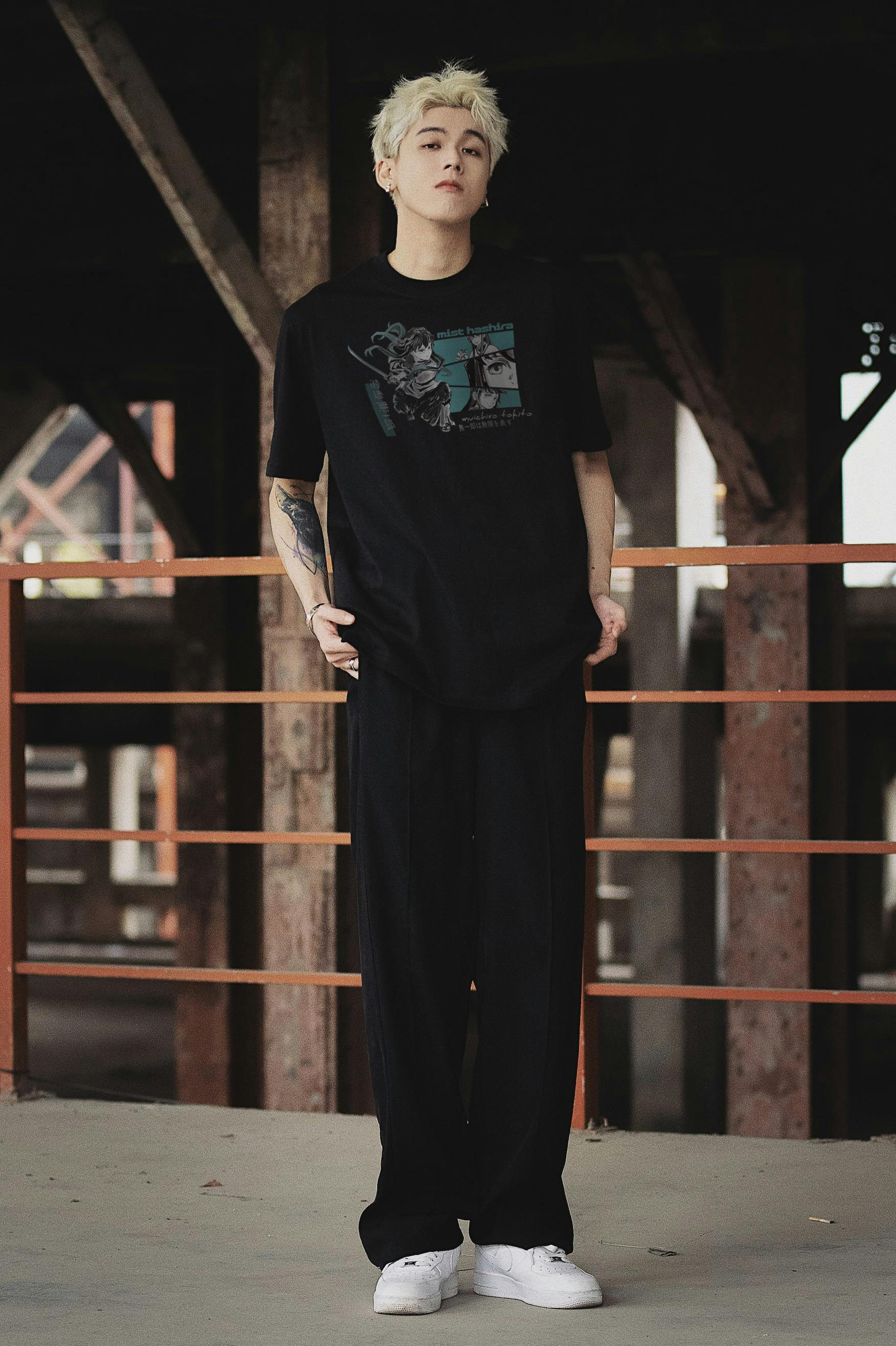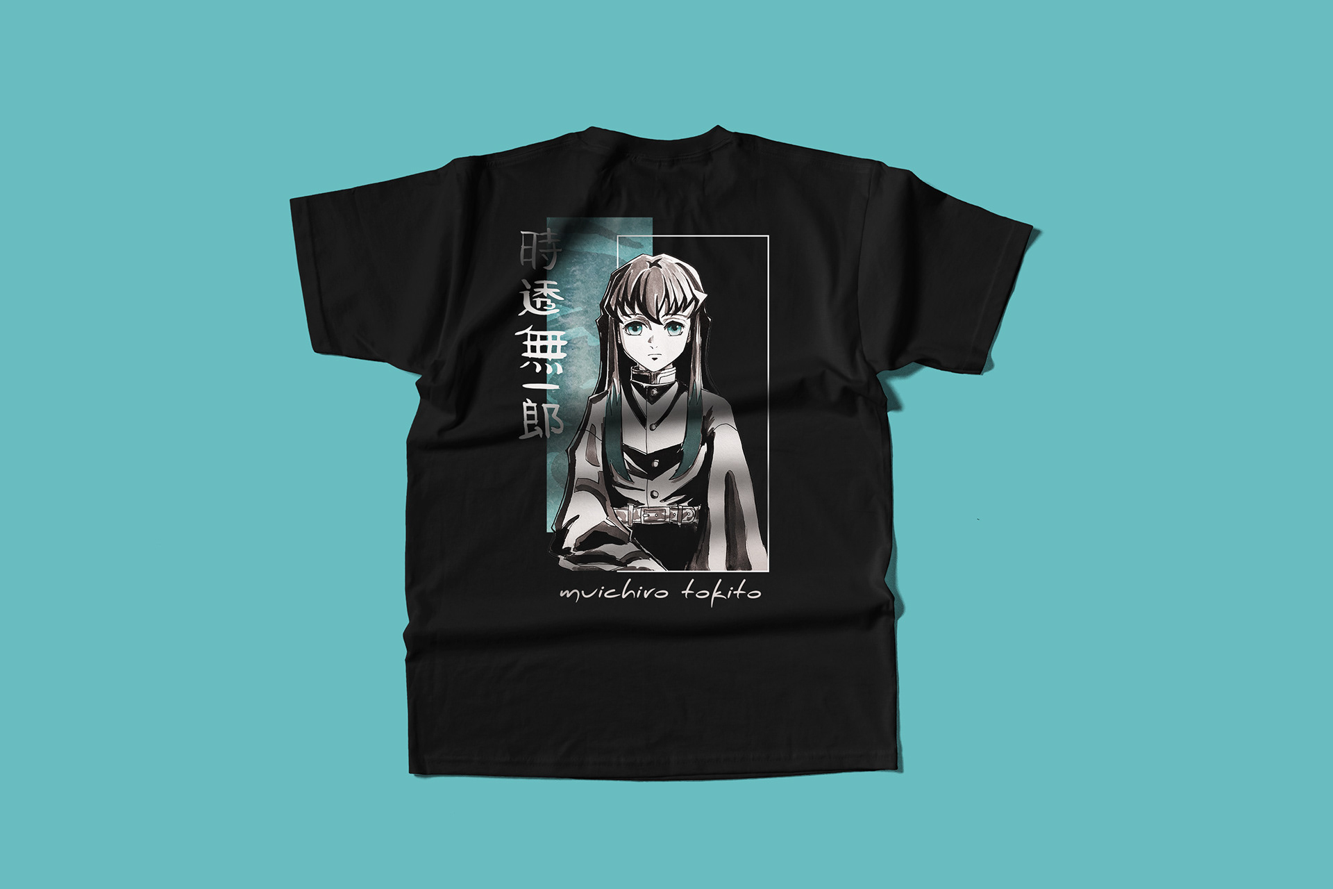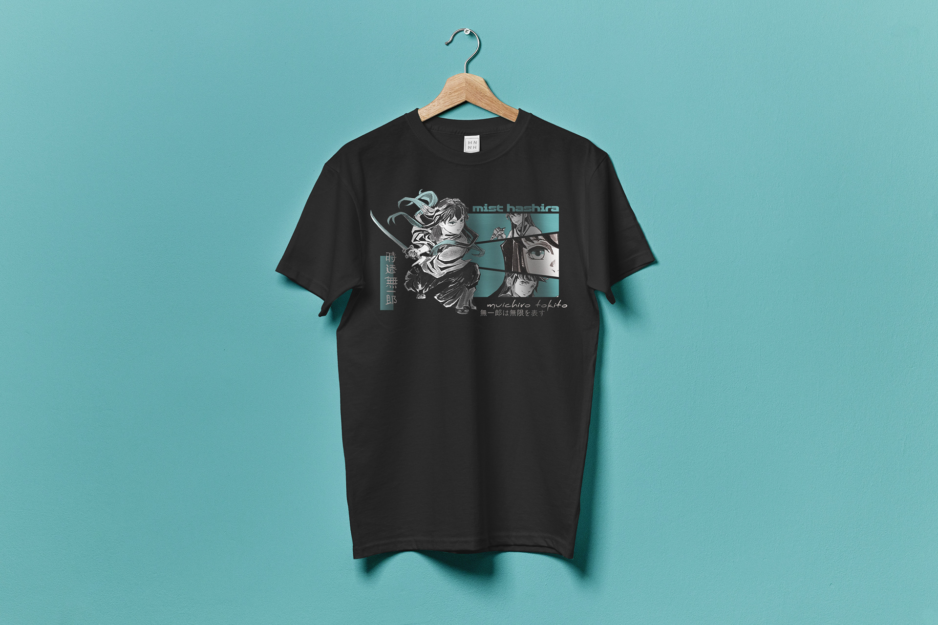 Tokito Muichiro (時透 無一郎) t-shirt design layout with hand-drawn illustrations featuring the Mist Hashira from Demon Slayer: Kimetsu no Yaiba