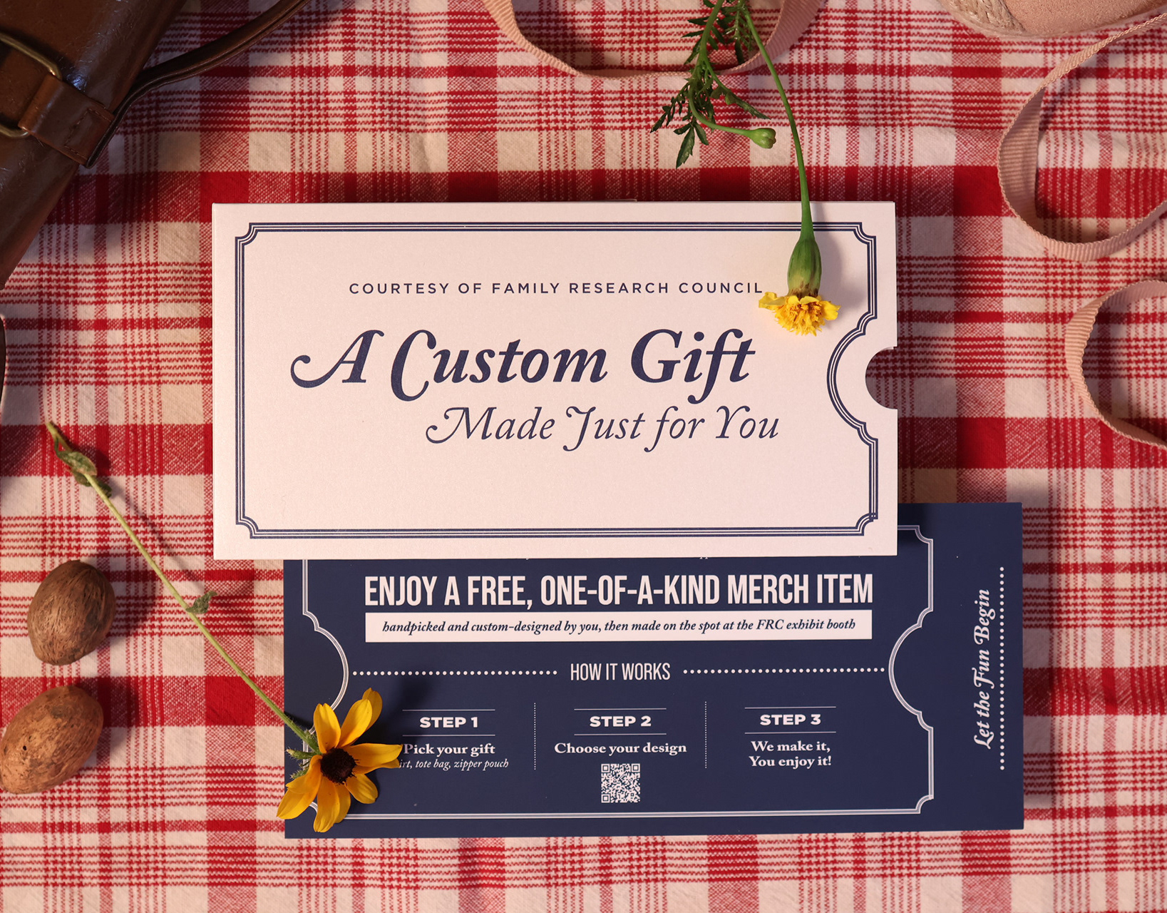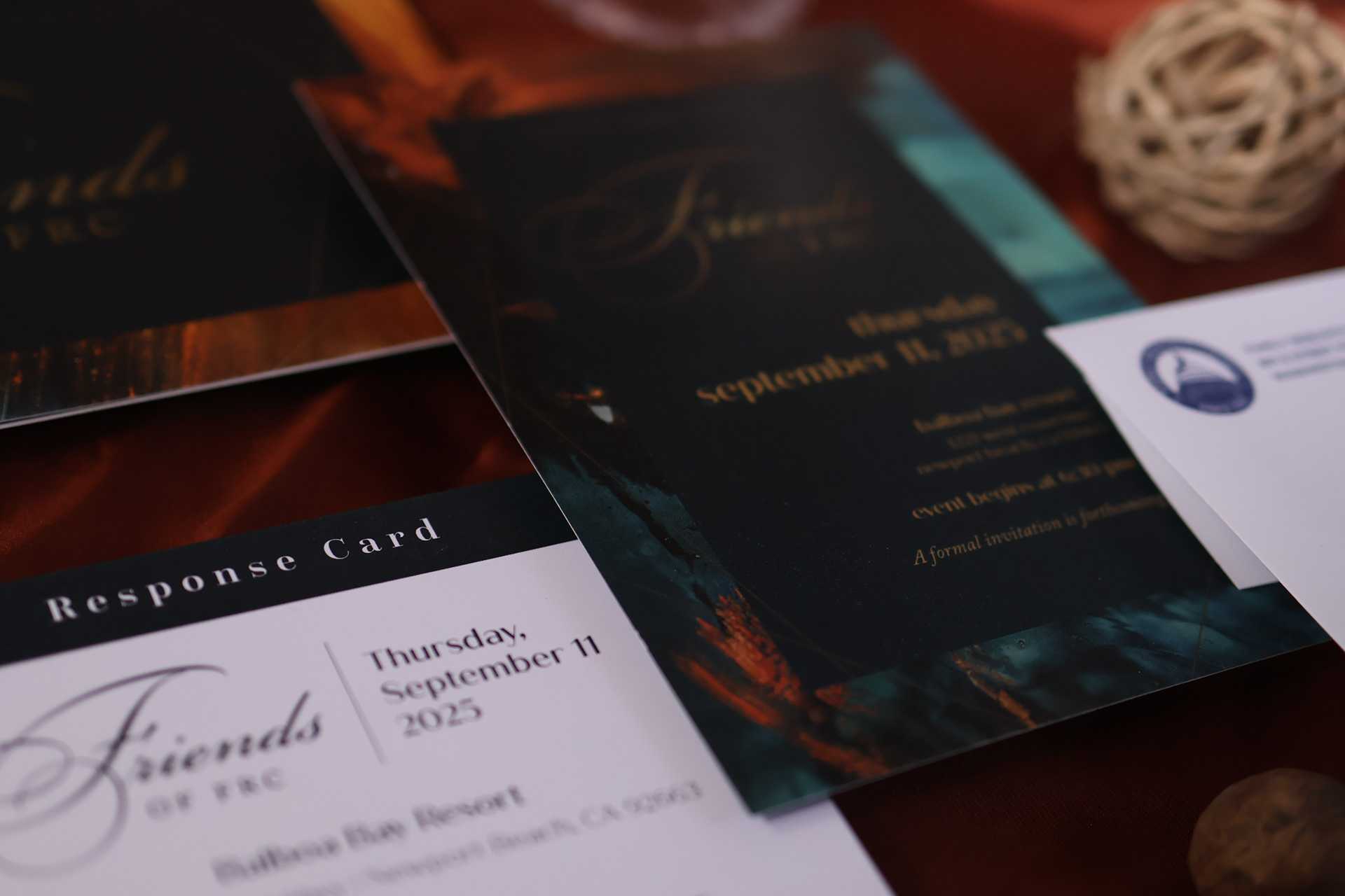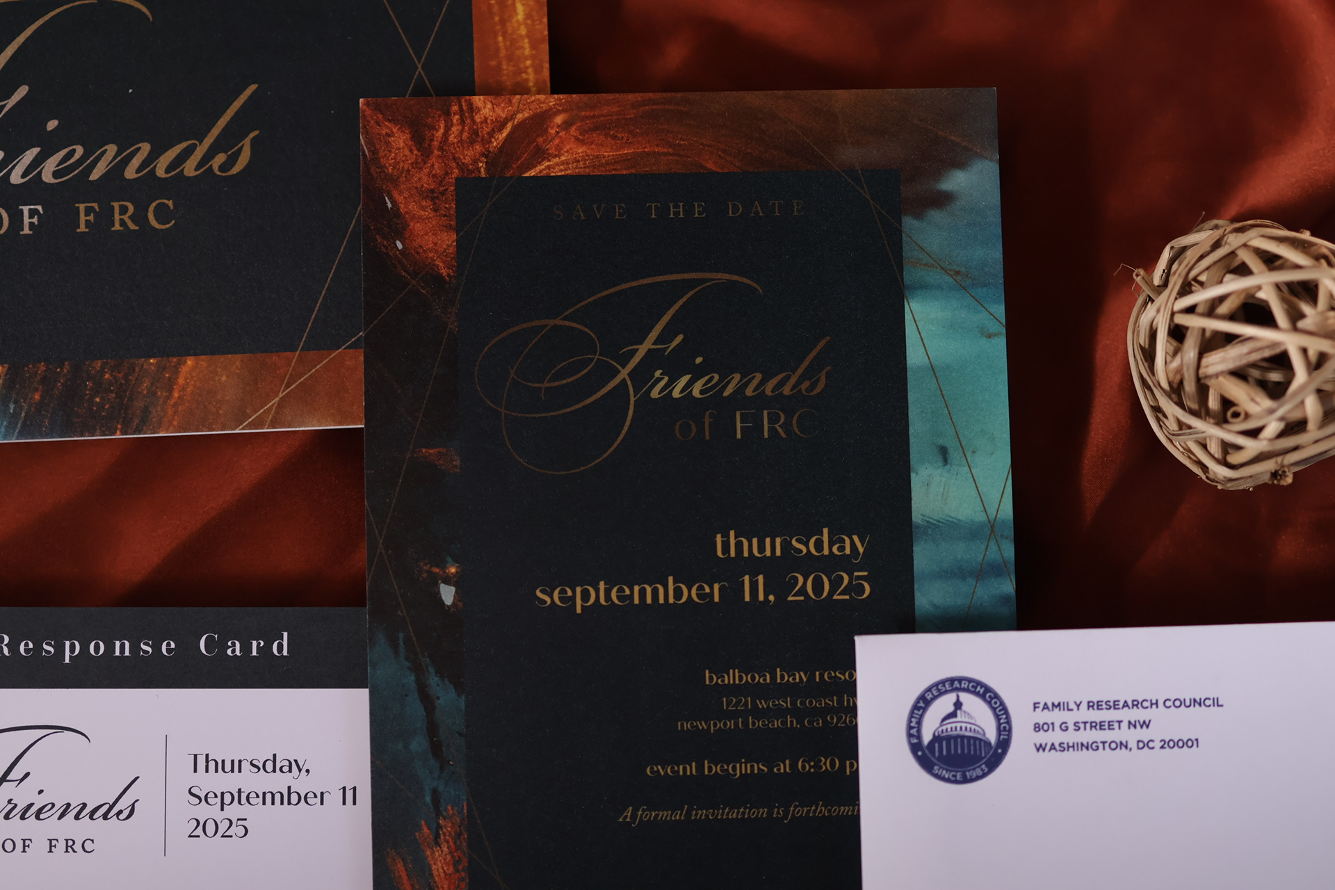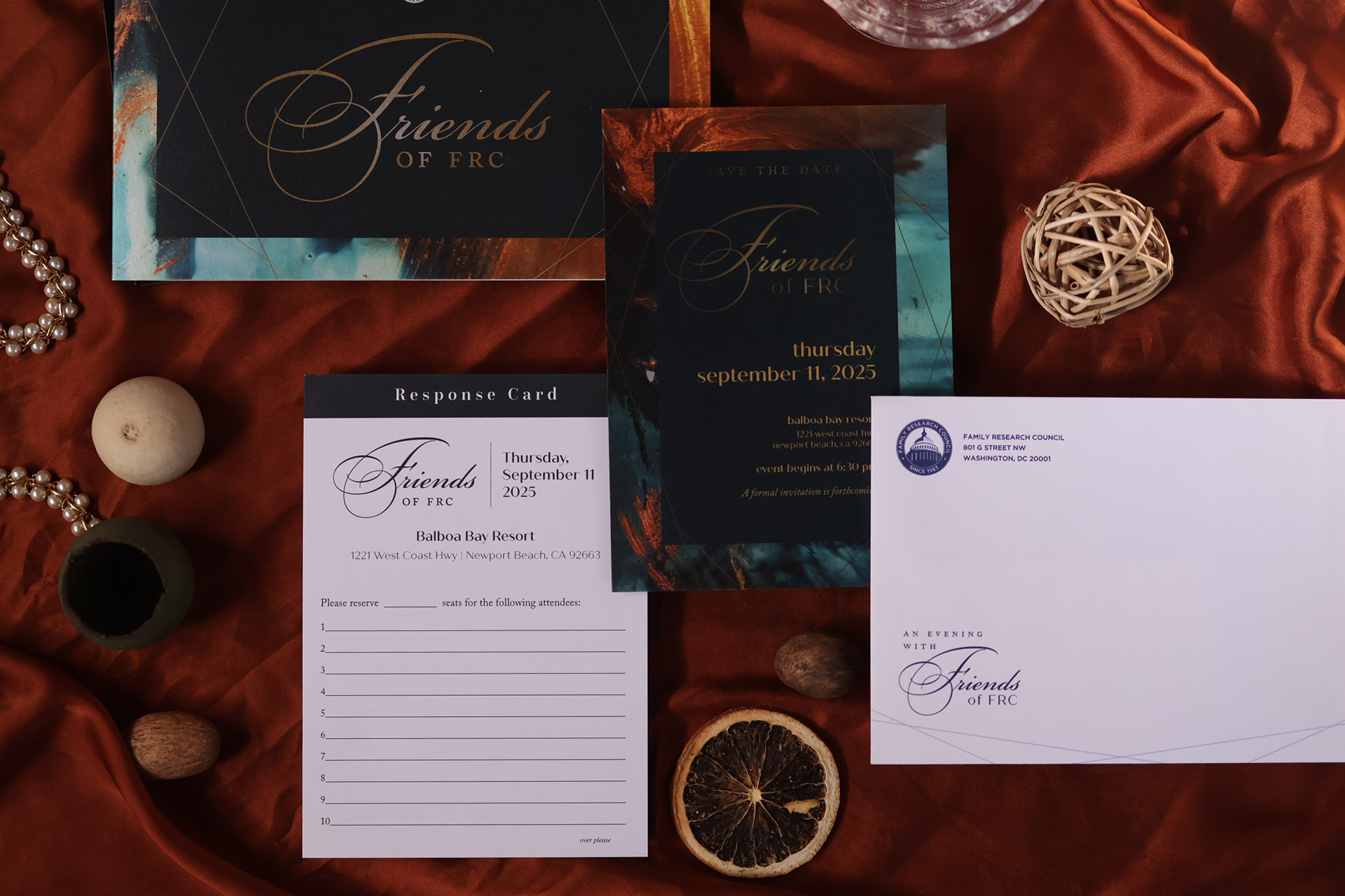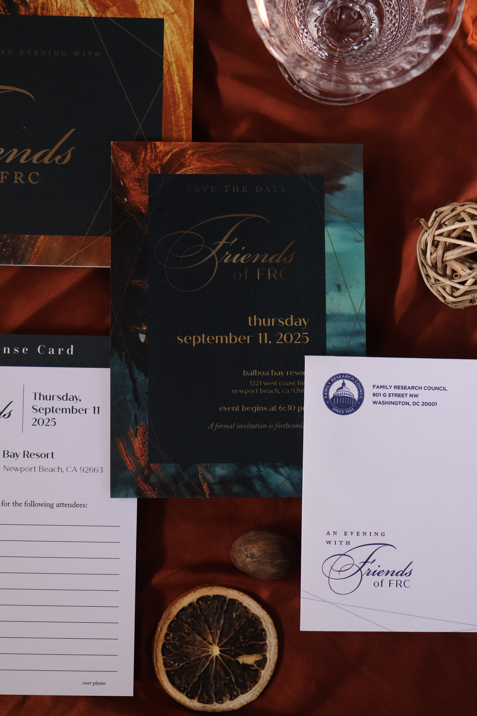 Upscale gala invitation set, complete with RSVP card, program and invite, and corresponding envelopes. This set was printed on pearlescent beargrass paper and metallic gold ink for Family Research Council's 2025 annual banquet hosted in Orange County, California.
