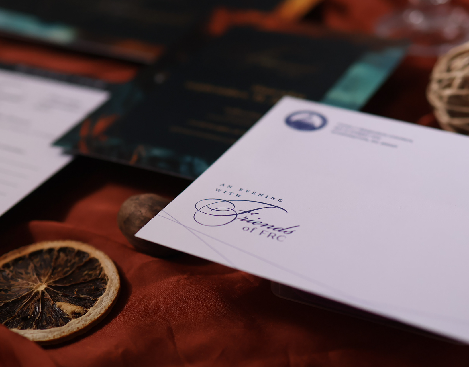 Exquisite custom envelope and ticket invitation, printed on pearlescent beargrass paper and transparent raised ink as merchandise material for Family Research Council at the 2025 Social Conservative Policy Conference.